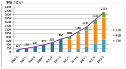 2006年至2016年我国卫星导航与位置服务产业产值分布图