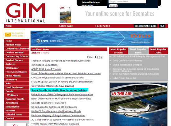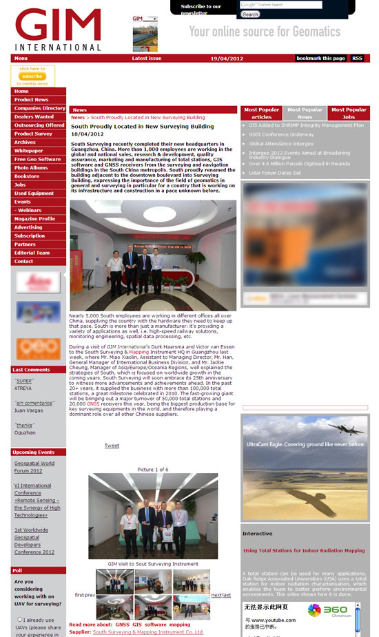 今日,《GIM》官方网站刊登南方专题报道——《傲然挺立、昂首向前的南方》(South Proudly Located in New Surveying Building),文章介绍了南方测绘近年来的发展状况,肯定了南方在中国测绘行业中的地位。