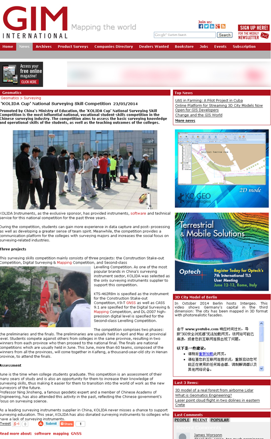 近期,“科力达杯”全国职业院校测量大赛在全国各地正如火如荼地进行着,各媒体、网站对2014年全国各省赛区的测量大赛情况进行了报道,其中,地球空间信息学全球性权威杂志——《GIM杂志》图文报道了“科力达杯”全国测量技能大赛。《GIM》是一本专注于地球空间信息学方面全球最新发展动态,其内容涵盖该领域的全球最新产业消息和科研进展的杂志,其读者群主要面向世界范围内的、活跃在地球空间信息学领域中的、对决策有影响力的专业人士。文中,《GIM》对“科力达杯”全国测量技能大赛进行了详细地剖析和全面地报道,并在其Newsletter中向读者进行定向推送。