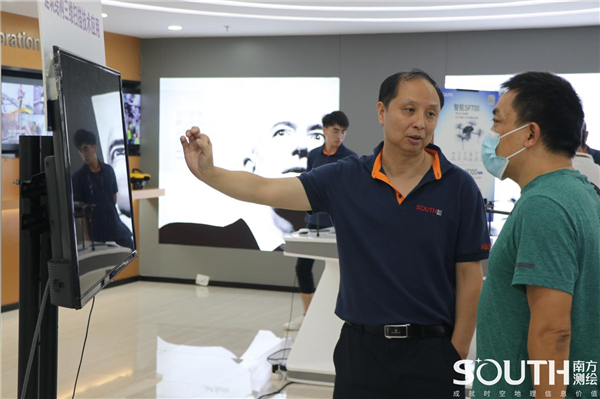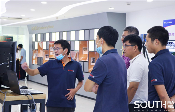 老师们首先参观了南方测绘技术成果展示厅。展厅详细展示了南方智能监测技术及行业应用、建筑结构三维扫描技术应用、iData点云数据采集平台、倾斜摄影无人机、北斗教学系统平台、测绘虚拟仿真教学系统、智能安卓全站仪等前沿技术产品和高精度测绘装备。