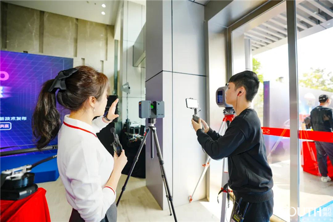 在南方测绘三维激光装备展区。技术人员展示了由南方测绘全面自主研发生产的3款产品。