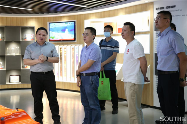 在缪小林等的陪同下,王伟东一行参观了南方测绘体验中心,缪小林向来宾详细介绍了南方测绘的发展历程、技术装备和企业文化等内容,双方结合各自所在领域的技术和业务探索,对南方测绘在智慧物联服务、地理信息应用服务、数字孪生等方面的技术探索和产业成果进行了简短交流。