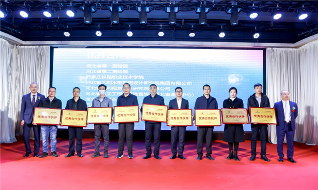 南方测绘集团石家庄分公司成立20周年,一路以来结识了众多伙伴,精诚合作,携手共进。为表示对合作伙伴的感谢,葛瑞华与孟祥光在会议现场为河北省第一测绘院、河北省第二测绘院、河北省水利水电勘测设计研究院集团有限公司、核工业航测遥感中心、石家庄学院等20家优秀合作单位颁发优秀合作伙伴牌匾。