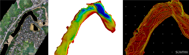 技术团队采用了南方SU20无人船搭载测深仪测量水下地形、南方无人机挂载倾斜摄影相机测量两岸地形,当晚就完成了水下外业勘测,并于7日上午完成了全部外业勘测。内业小组争分夺秒处理测量数据,生产三维实景模型并绘制两岸标准地形图,7日中午输出了初步成果。