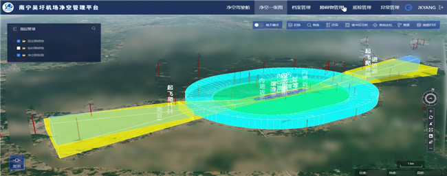 (2)净空管理系统:基于GIS开发,建立了机场净空管理系统,提供净空“一张图”、障碍物管理、档案管理、巡检管理、异常管理等功能,系统采用“WEB端+移动端”的方式,实现“低慢小”、建筑物等影响飞机安全运行障碍物管理,守护机场净空安全,如图7所示。