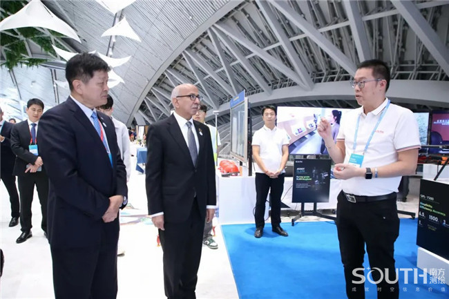 联合国助理秘书长纳维德·哈利夫(右二)联合国全球地理信息知识与创新中心主任李朋德(右三)莅临南方测绘展位