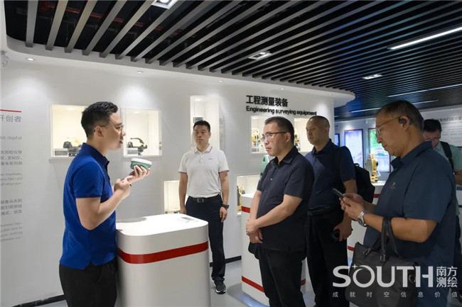 李传军一行在测绘产品事业部直销部总监刘自强的带领下参观了南方测绘体验中心,在这里了解了南方测绘的发展历程以及相关技术和行业应用成果。南方测绘业务范围涵盖光电测绘装备、高精度卫星导航定位、激光雷达测量系统、无人机航测、海洋测绘、精密监测及精准位置服务、遥感数据服务、数据工程、GIS平台软件系统及智慧城市应用等。参观期间,李传军一行对全站仪、RTK、管线探测仪等产品颇为关注,就产品研发及其在城市生命线、室内外定位导航、矿山安全监测等场景的应用进行了探讨。