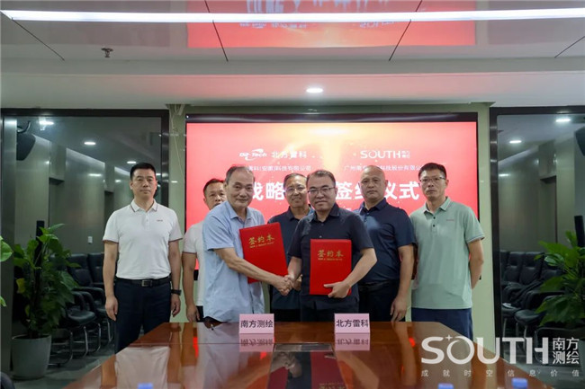 近日,北方雷科(安徽)科技有限公司(以下简称“北方雷科”)与南方测绘战略合作协议签约仪式在南方测绘集团总部举行。北方雷科董事长李传军,北方雷科产业事业部常务副总经理李勇到访集团总部,南方测绘集团创始人、董事长马超,测绘产品事业部总经理杨艺,项目应用事业部总经理邓万军,集团安徽分公司总经理吴兆龙等接待了来宾。