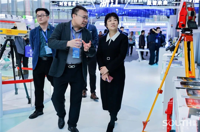 自然资源部党组成员、副部长庄少勤在南方展台前驻足停留,对国产全站仪桂冠之作——NT10机器人颇为关注,仔细询问了NT10在各行业领域的应用情况,对南方测绘的国产化之路表示肯定。庄副部长还关切了集团海外市场布局规划,以及光电仪器、激光产品的核心技术优势与热销产品的全球市场竞争力,鼓励南方立足优势,稳健发展。