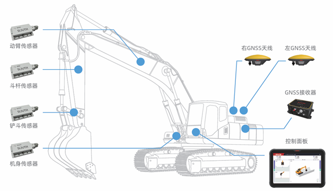南方测绘挖掘机引导系统,是基于GNSS高精度定位及倾角传感器融合技术打造的智能化施工核心装备。系统通过双GNSS天线、多组工业级倾角传感器,实时获取挖掘机机身、动臂、斗杆、铲斗的精准位置与运动姿态数据,铲尖水平和高程精度可达±3cm,结合工程测绘与设计数据,为挖掘机操作手提供实时可视化引导,实现精准挖掘作业,从源头保障施工质量,彻底告别传统施工依赖经验、精度不足的行业难题。
