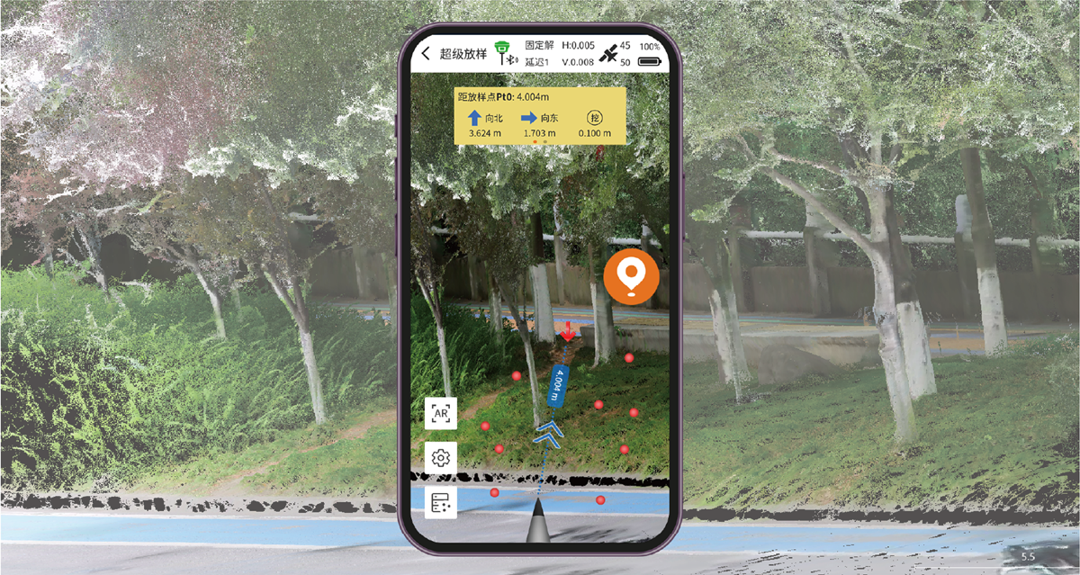 创新三维点云可视化系统,支持多目标点位智能标定与路径规划。测量员可通过AR界面实时查看放样轨迹,结合智能导航指引,精确找寻目标,大大缩减作业耗时。