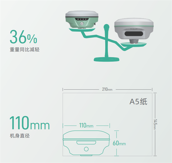 南方最新轻量化RTK,重量同比减轻36%。机身直径110mm,单手可握。内置实景双摄,机身更小,功能更多,测量无阻,作业无负。高度集成化电路设计。优化结构布局,实现核心功能模块的高度集成,显著缩小设备体积。天线使用全新的介质和制作工艺,更轻更小的同时保证天线性能。