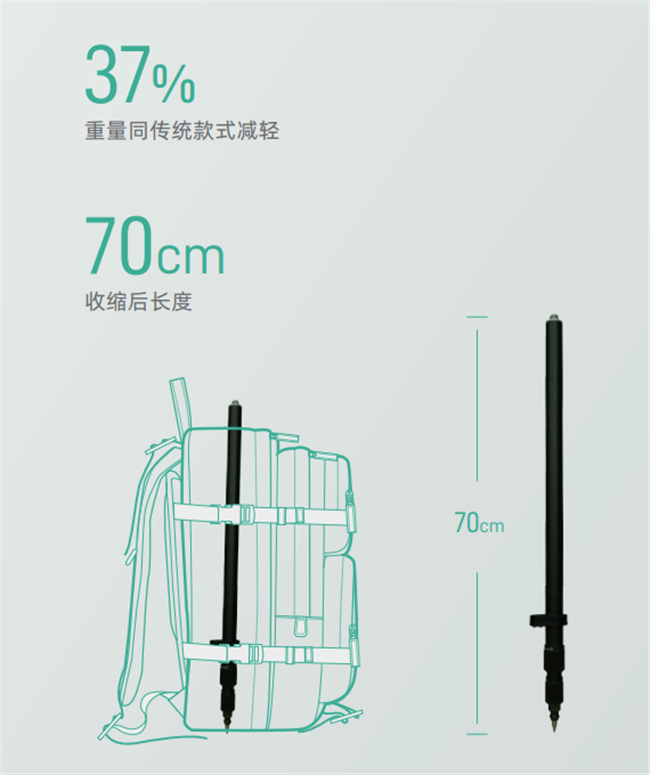 搭配轻型对中杆,三节伸缩式结构轻便易带,全新工艺改良,其重量相比传统款式减轻了37%,收缩后长度70cm,灵活收纳,轻松出行。