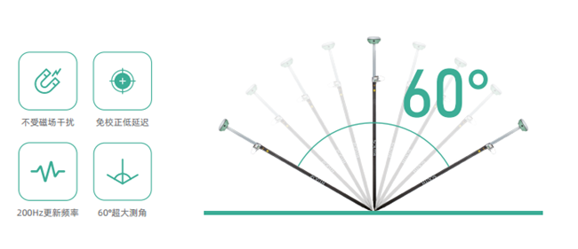 无感校正,60°超大测角,200Hz超高更新率,比传统测量效率提升30%,无需对中,点到即测。