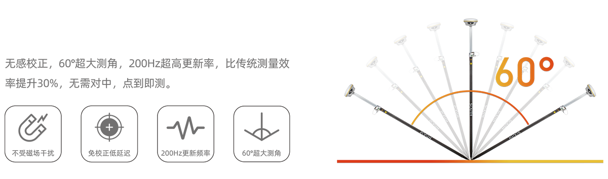 惯导倾斜测量 | 内置IMU惯性测量传感器,支持惯导倾斜测量功能,根据对中杆倾斜方向和角度自动校正坐标 |