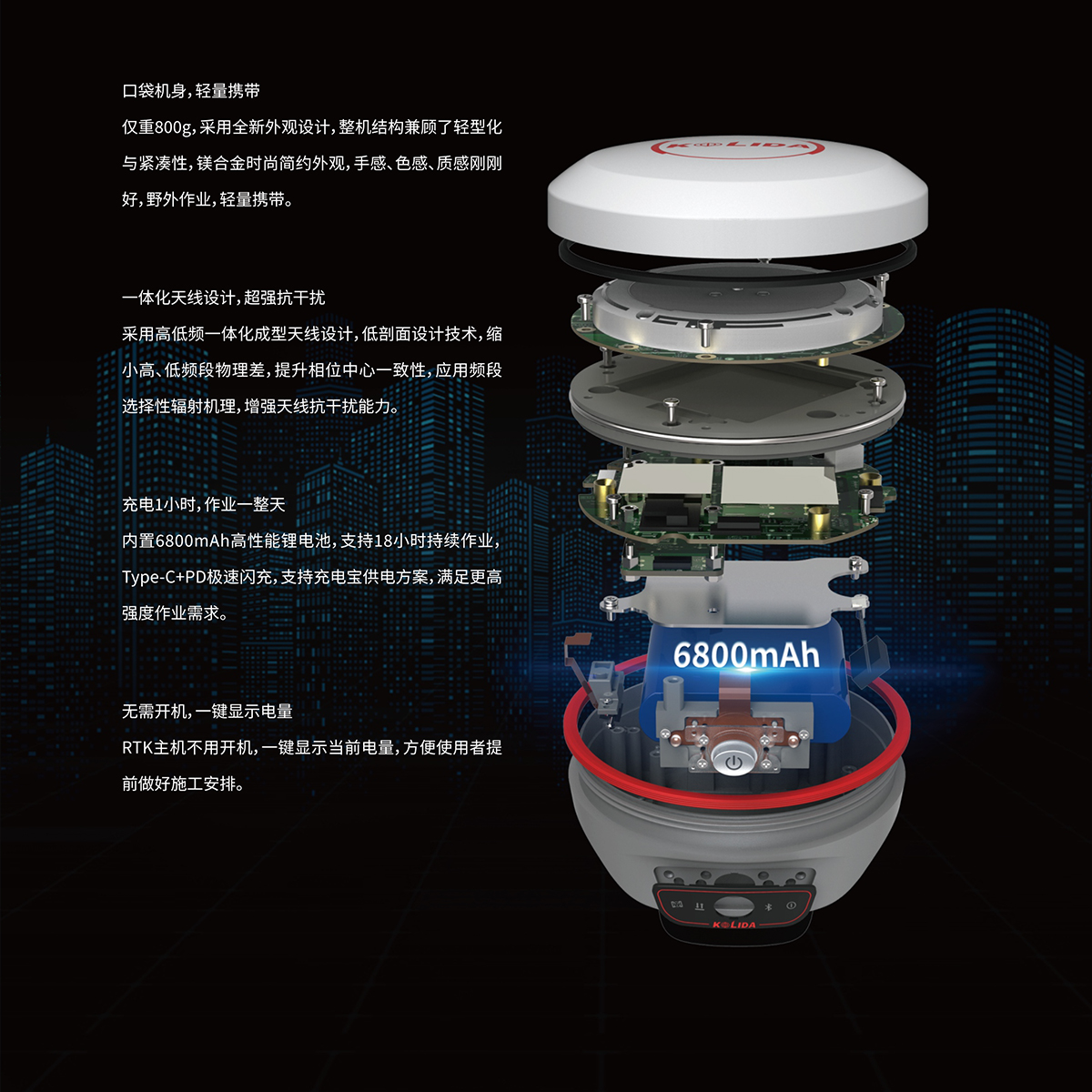内置6800mAh高性能锂电池 7.4V;移动站手簿网络模式作业满足18小时续航时间