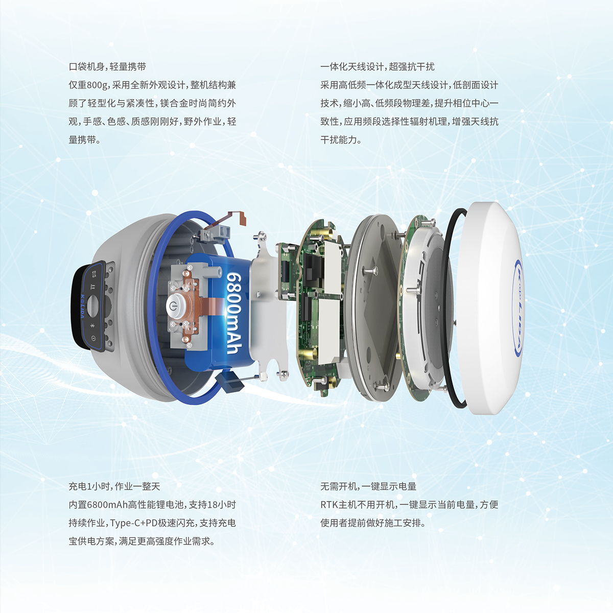 电池 | 内置6800mAh高性能锂电池 7.4V;移动站手簿网络模式作业满足18小时续航时间 |