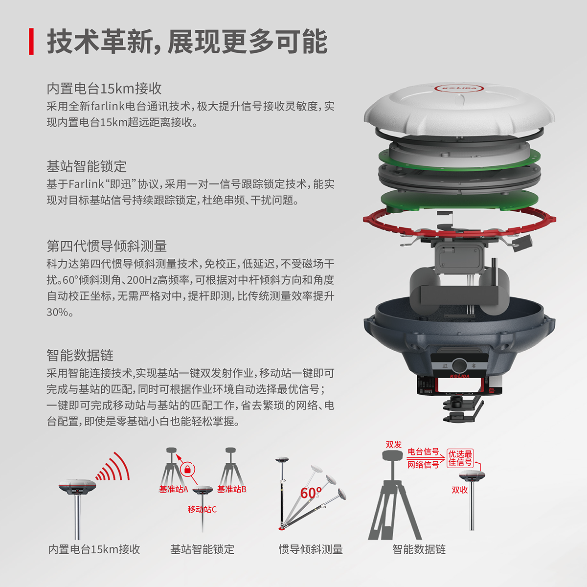 惯导倾斜测量 | 内置IMU惯性测量传感器,支持惯导倾斜测量功能,根据对中杆倾斜方向和角度自动校正坐标。 |