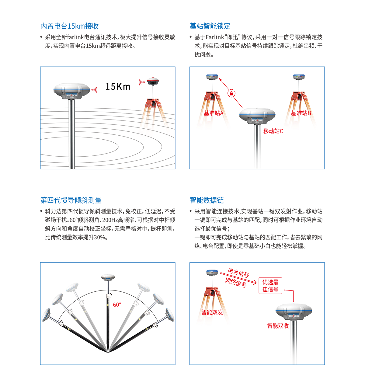 惯导倾斜测量 | 内置IMU惯性测量传感器,支持惯导倾斜测量功能,根据对中杆倾斜方向和角度自动校正坐标。 |