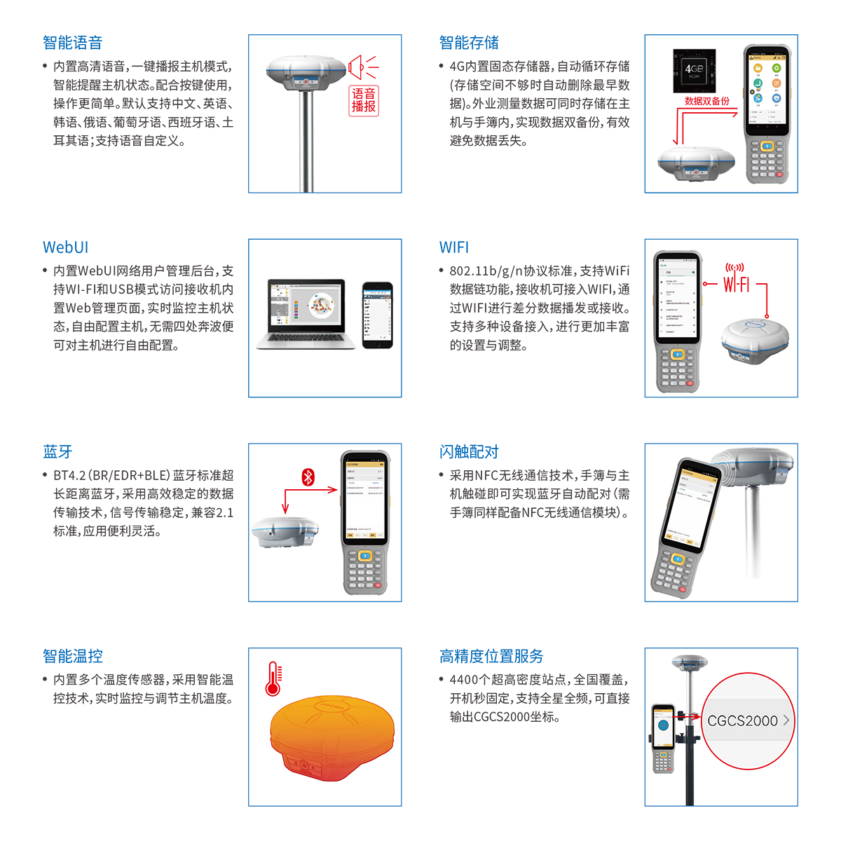 web交互 | 内置Web UI管理后台,支持Wi-Fi和USB模式访问接收机内置Web UI管理页面,实时监控主机状态,自由配置主机。 |