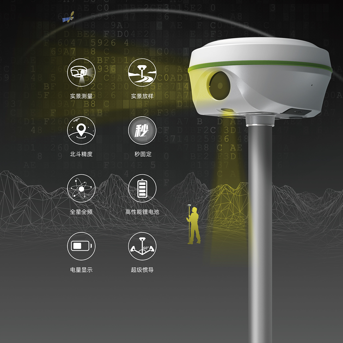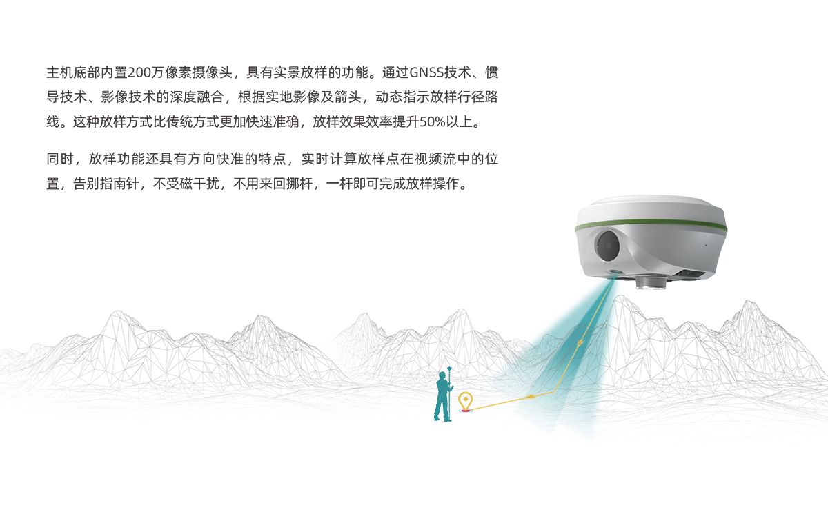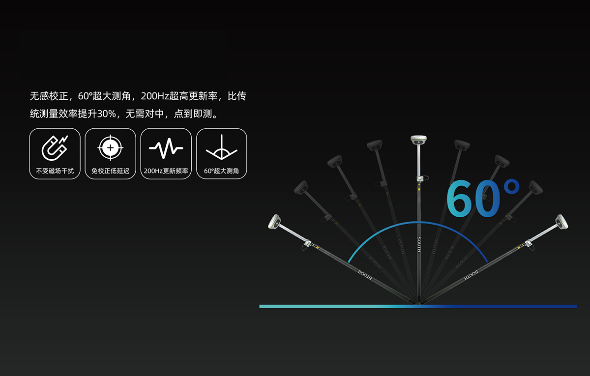 惯导倾斜测量 | 内置IMU惯性测量传感器,支持惯导倾斜测量功能,根据对中杆倾斜方向和角度自动校正坐标。 |