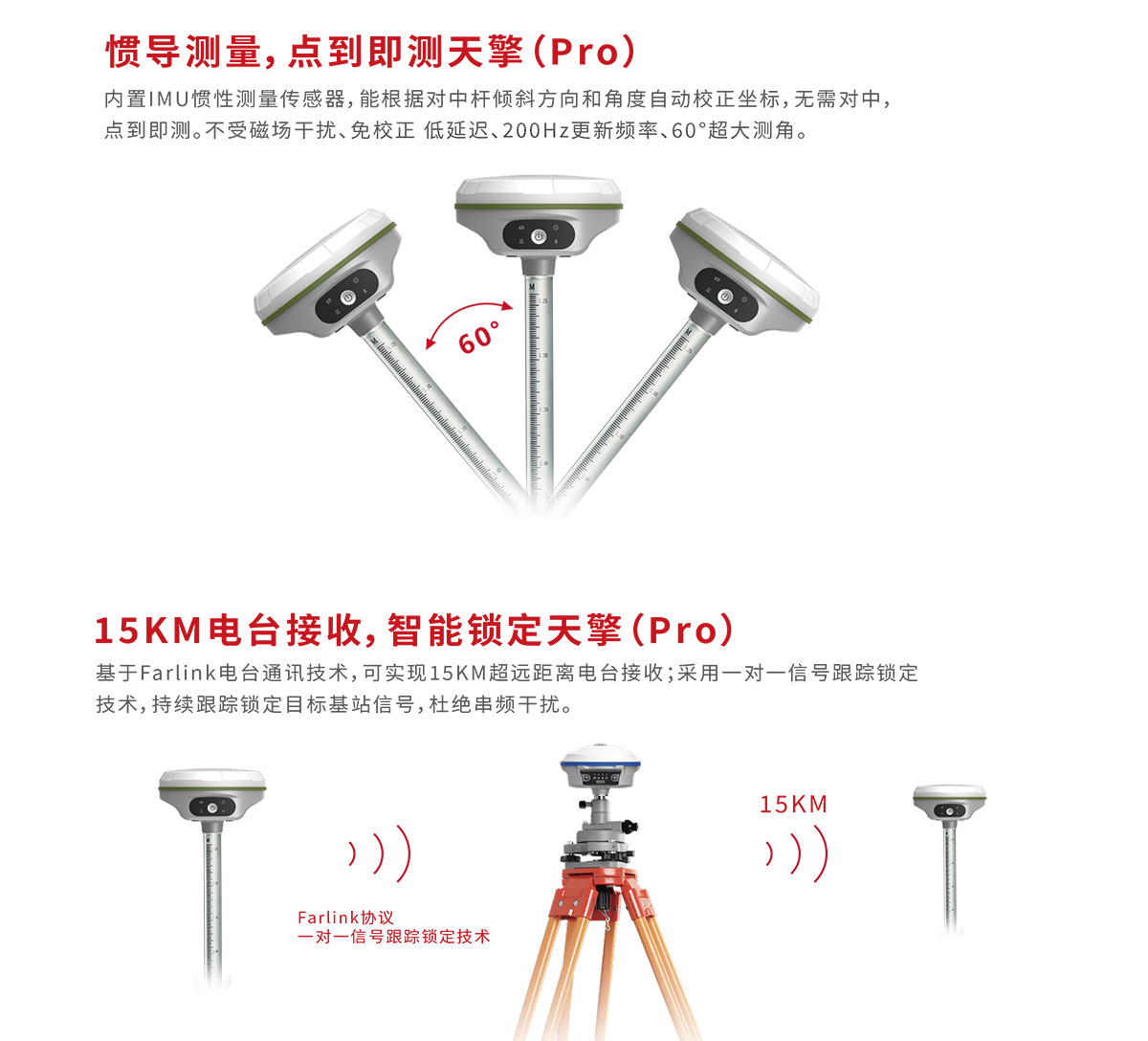 惯导倾斜测量 | 内置IMU惯性测量传感器,支持惯导倾斜测量功能,根据对中杆倾斜方向和角度自动校正坐标。 |