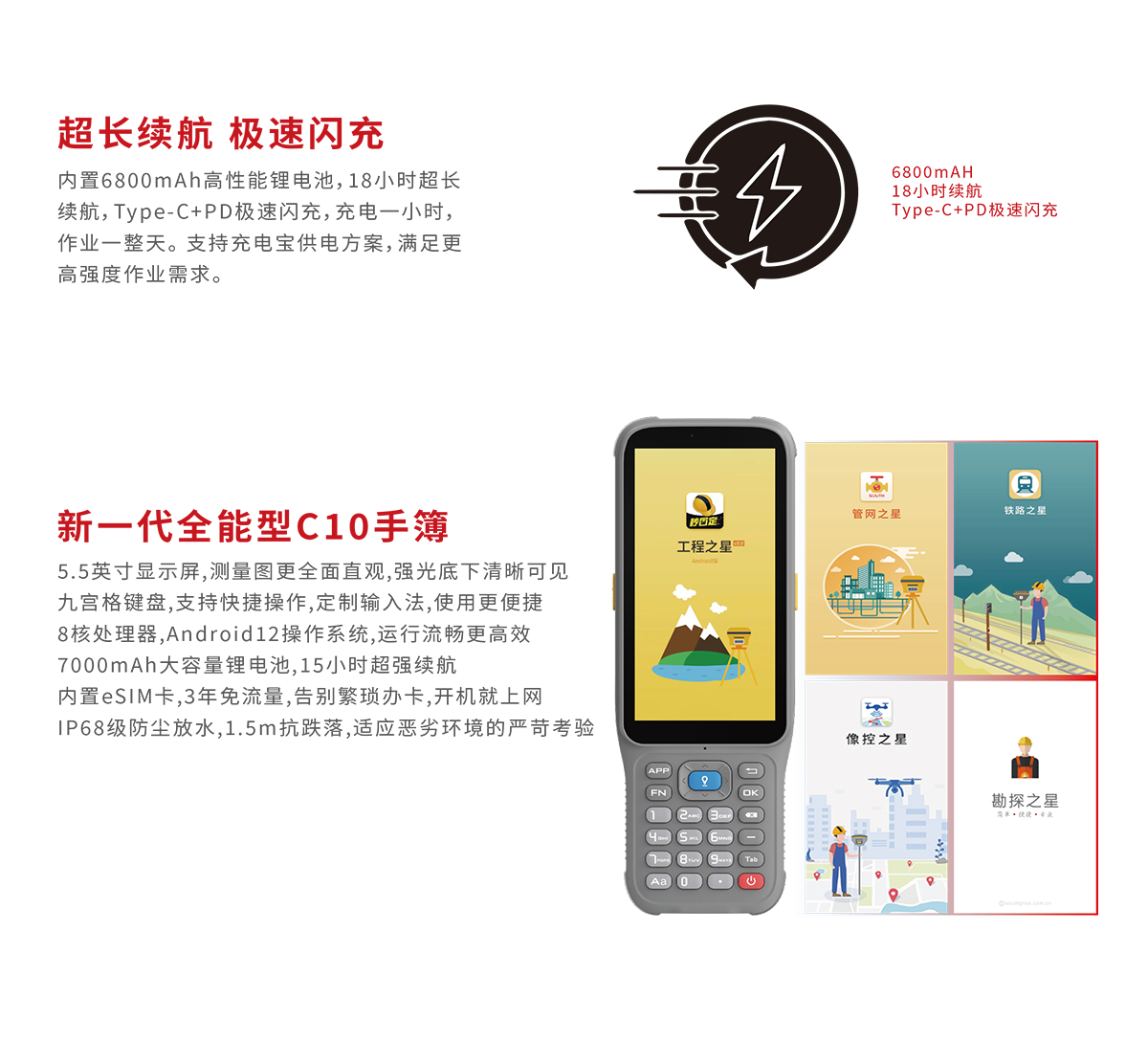 电池 | 内置6800mAh高性能锂电池 7.4V;移动站手簿网络模式作业满足24小时续航时间 |