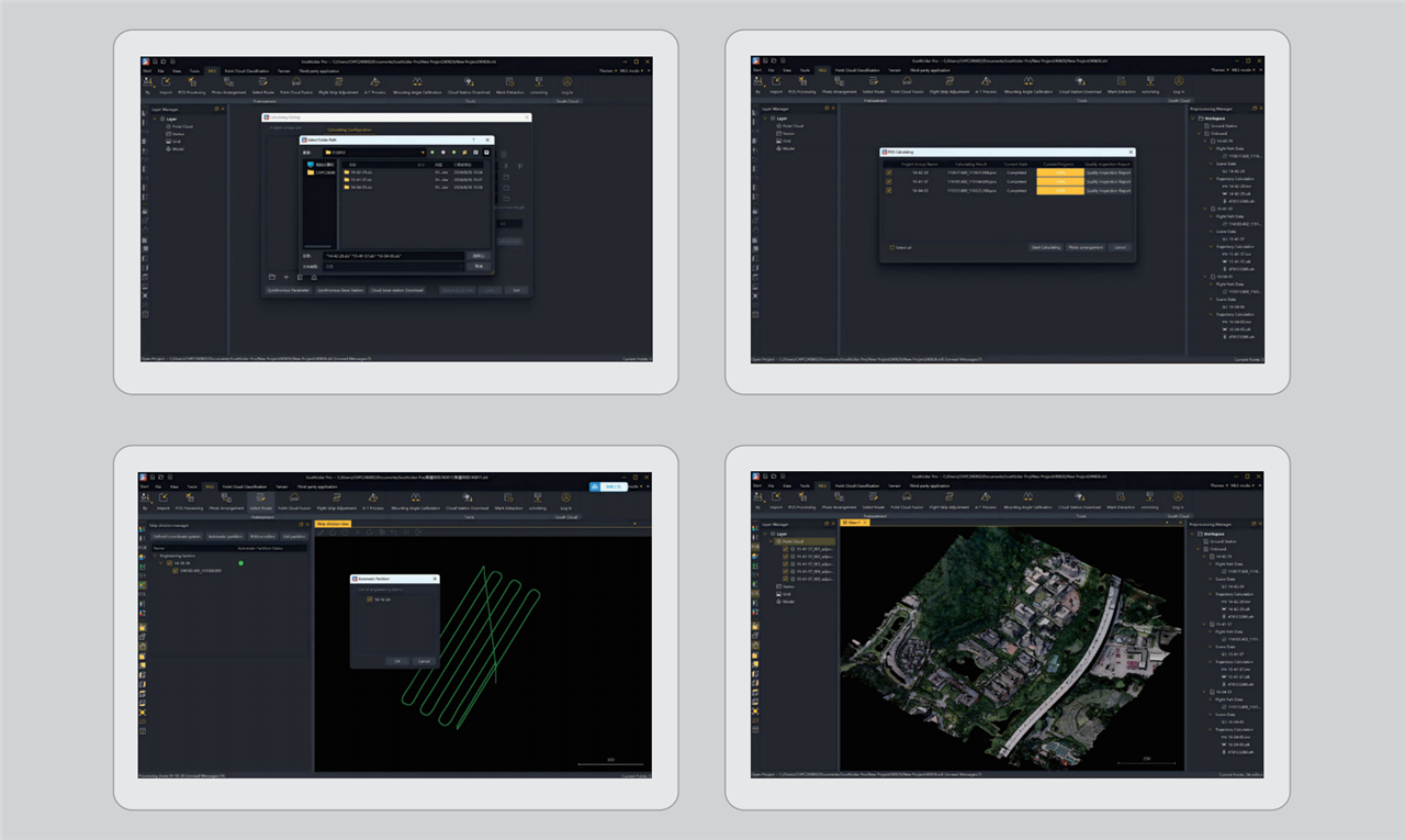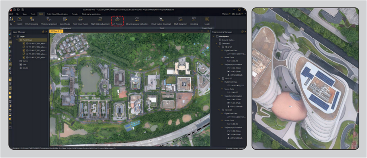 自主研发的三维激光一体化处理软件,能够处理架站式激光数据、机载激光雷达数据,并且可以导入多组数据,进行批量处理。