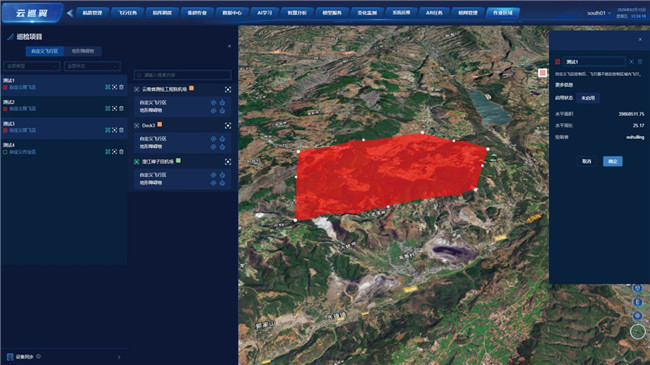支持地图可视化展示限飞区、禁飞区与作业区等空域范围,支持自定义飞行区域,实现低空空域的精细化管理和作业协同校验。